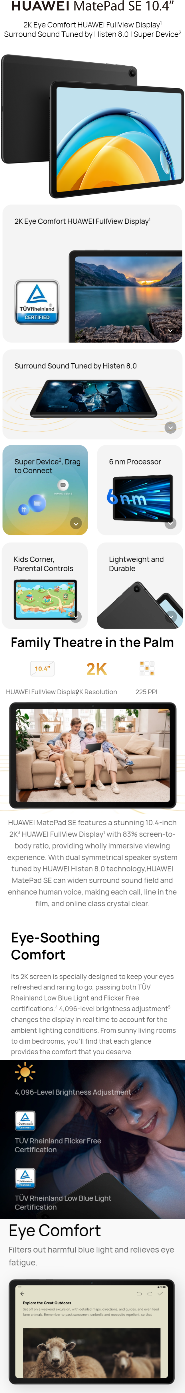 HUAWEI MatePad SE features a stunning 10.4-inch 2K HUAWEI FullView Display with 83% screen-to-body ratio, providing wholly immersive viewing experience.